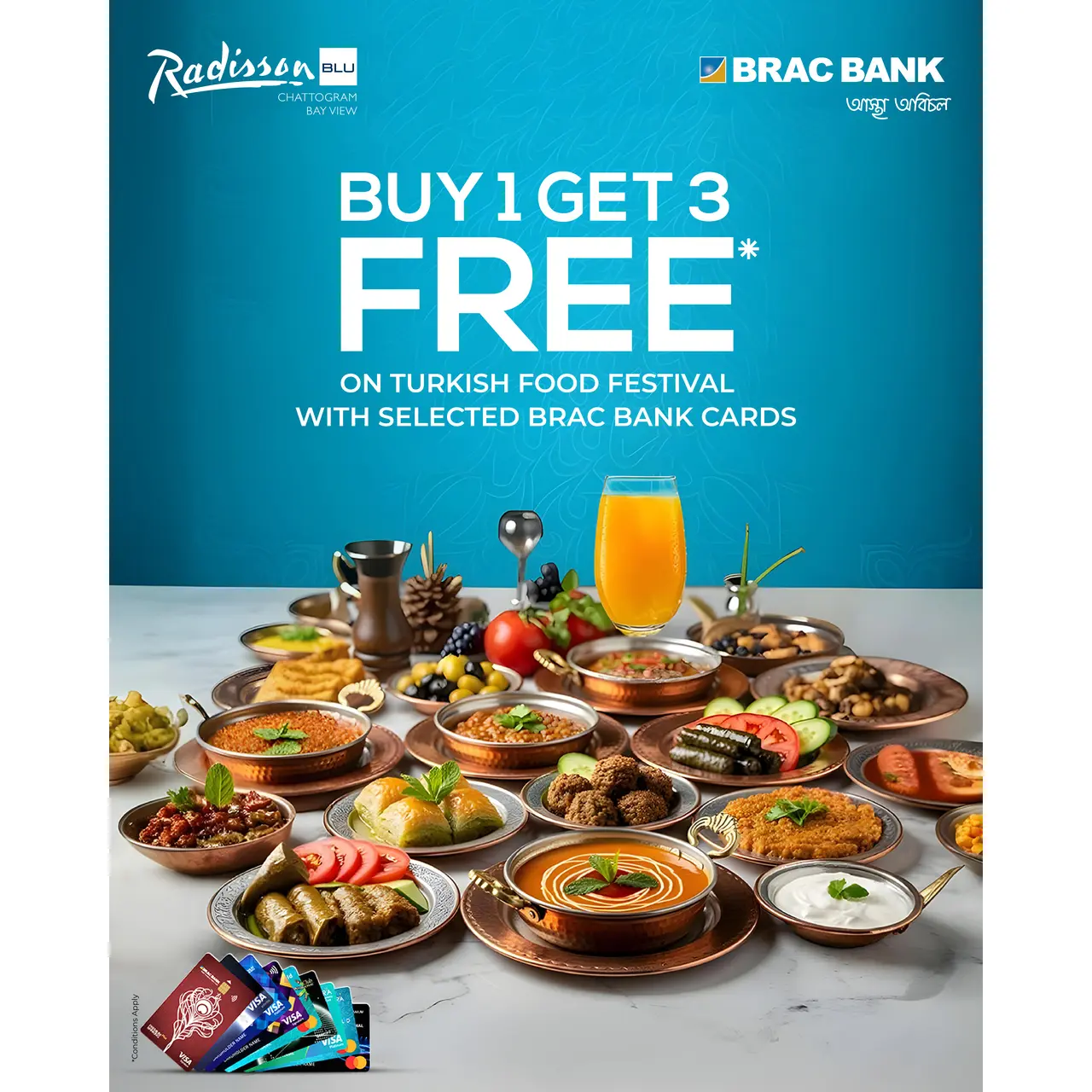 Offer: Enjoy Buy One Get Three Free during Turkish Food Festival at Radisson Blu Chattogram Bay View with selected BRAC Bank Cards!