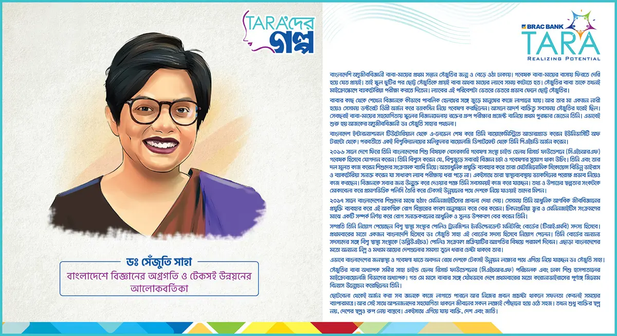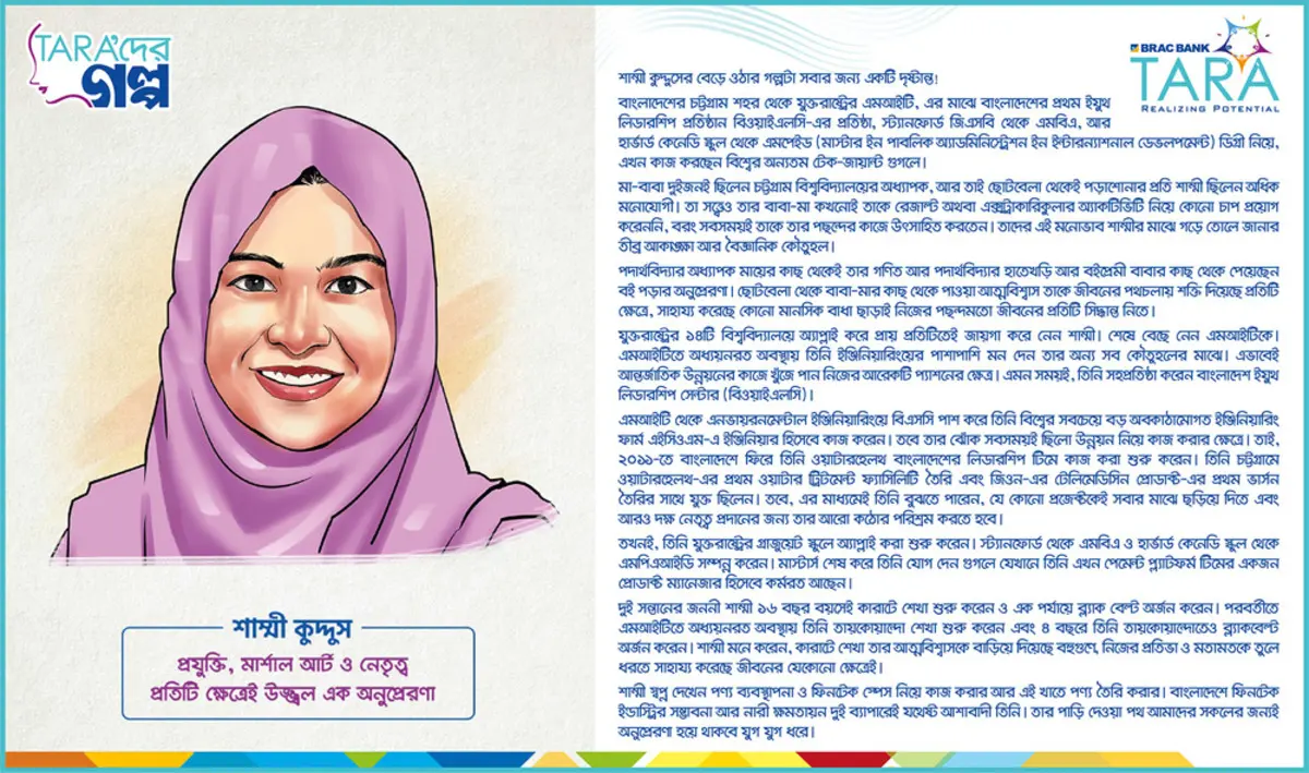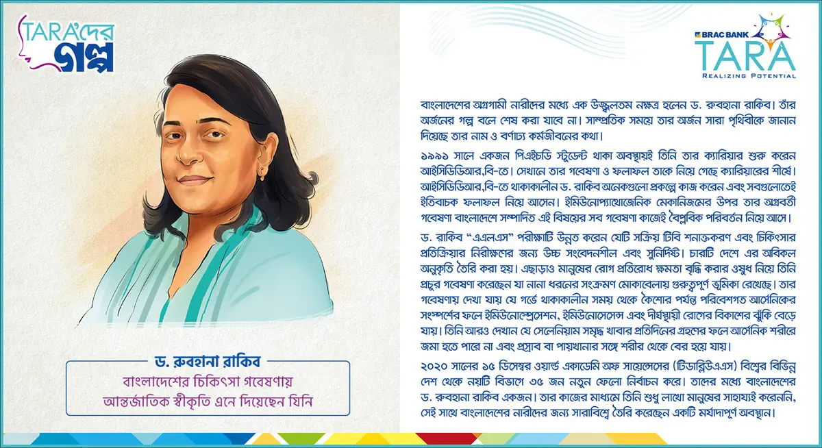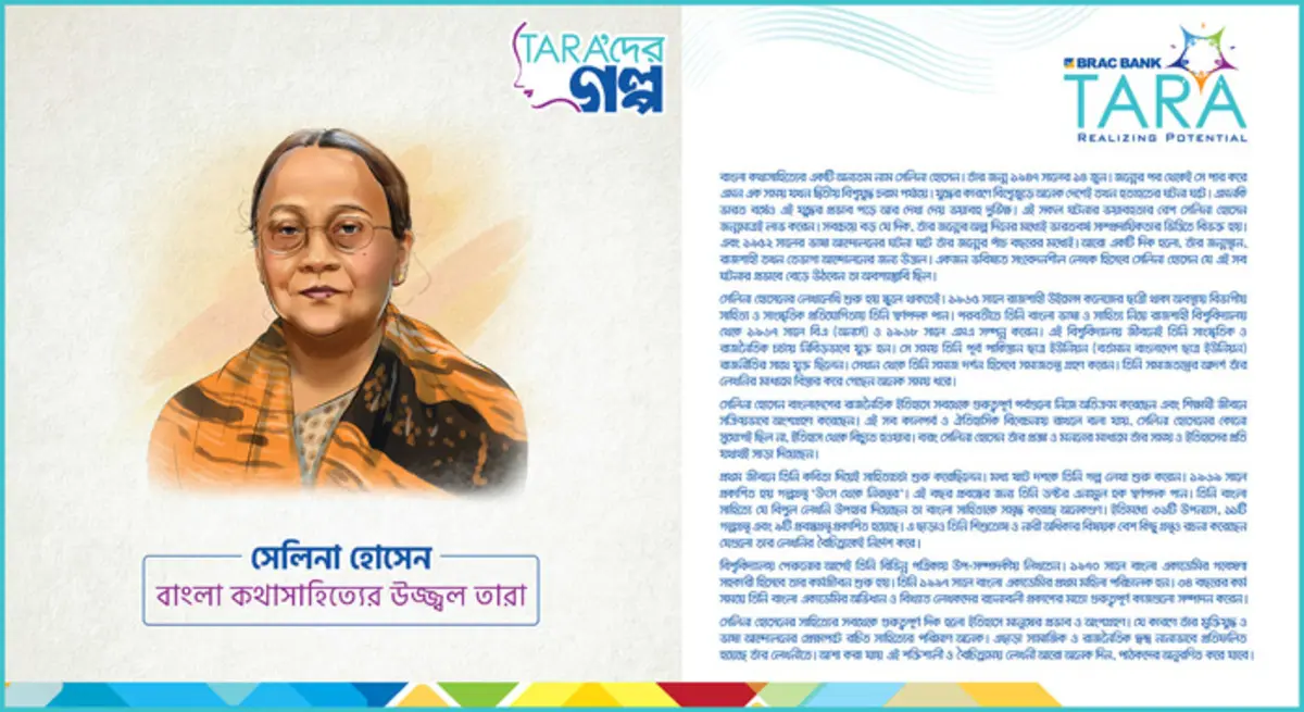 নানা প্রতিকূলতা সত্ত্বেও নিজ নিজ কর্মক্ষেত্রে বলিষ্ঠ ভূমিকা রাখছেন বাংলাদেশের নারীরা। নিজেদের কর্মদক্ষতা ও প্রচেষ্টা দিয়ে তারা যেমন তাদের কর্মক্ষেত্রে ঘটাচ্ছেন বিপ্লব, ঠিক তেমনভাবেই স্থাপন করছেন অনুপ্রেরণার নতুন এক দৃষ্টান্ত। দেশকে এগিয়ে নিয়ে যাওয়ার পাশাপাশি দেশের নারীসমাজের উন্নয়নেও রাখছেন অপরিসীম অবদান। তাদের সাফল্য তারার মতোই পথ দেখাচ্ছে বাংলাদেশের লাখো নারীদেরকে, নিয়ে যাচ্ছে নতুন সম্ভাবনার পথে। আসুন শুনি সেইরকম কিছু তারাদের গল্প।