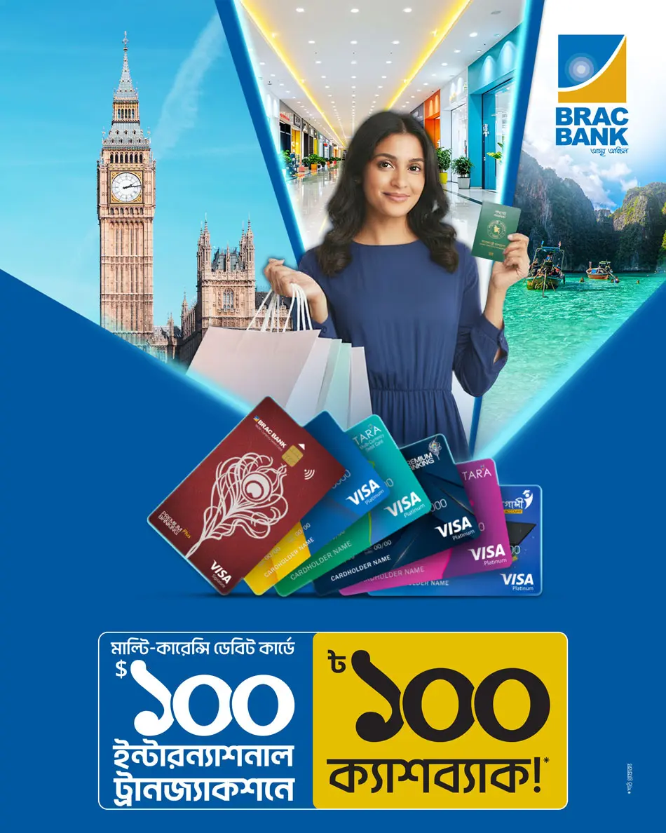 During the campaign, multi-currency debit cardholders will receive 100 Taka cashback if they spend a total of 100 US Dollars ($100) or its equivalent in foreign currencyby endorsing their debit card on their passport !