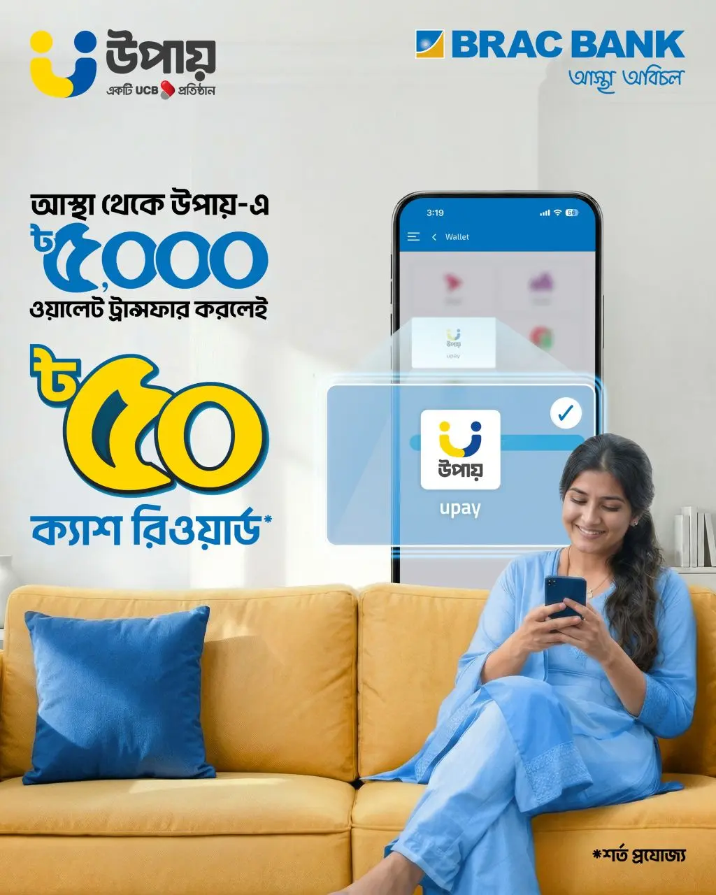 • upay customers will receive BDT 50 Cash Reward on BDT 5000 or more Add Money from BRAC Bank Smart banking app.