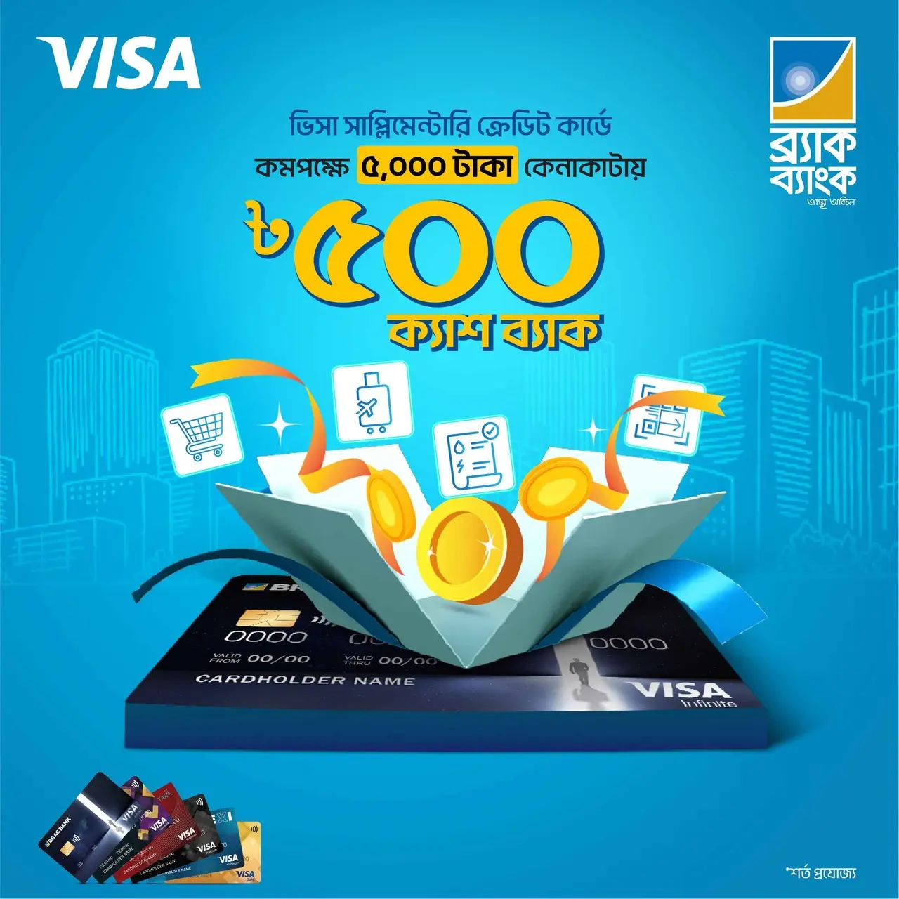 BDT 500 cashback on minimum retail spending of BDT 5,000 with your BRAC Bank VISA Supplementary credit card